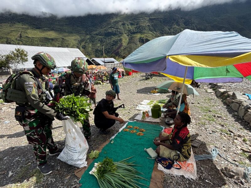 Senyum sederhana hadir di tengah hiruk pikuk Pasar Mulia, Distrik Mulia, Kabupaten Puncak Jaya, Papua, Sabtu (14/02/26). Di antara tumpukan sayur-sayuran segar hasil bumi pegunungan, Prajurit Satgas Yonif 743/PSY melangkah dengan hati tulus, melaksanakan kegiatan Belanja Kasih sebagai wujud kepedulian sekaligus dukungan bagi masyarakat.