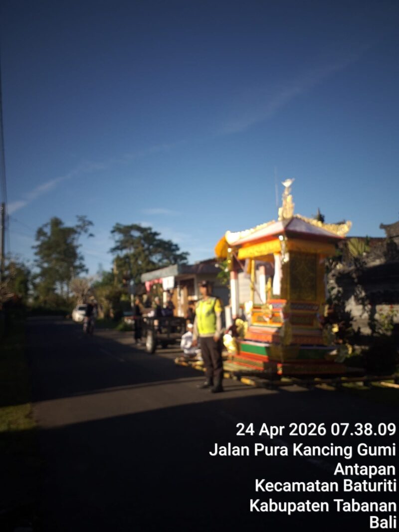 Tabanan – Polsek Baturiti melalui Bhabinkamtibmas Desa Antapan AIPTU I Putu Gede Widama melaksanakan pengamanan kegiatan upacara Ngaben pada Jumat, 24 April 2026 pukul 06.00 Wita sampai dengan selesai bertempat di Desa Adat Gelogor, Desa Antapan.