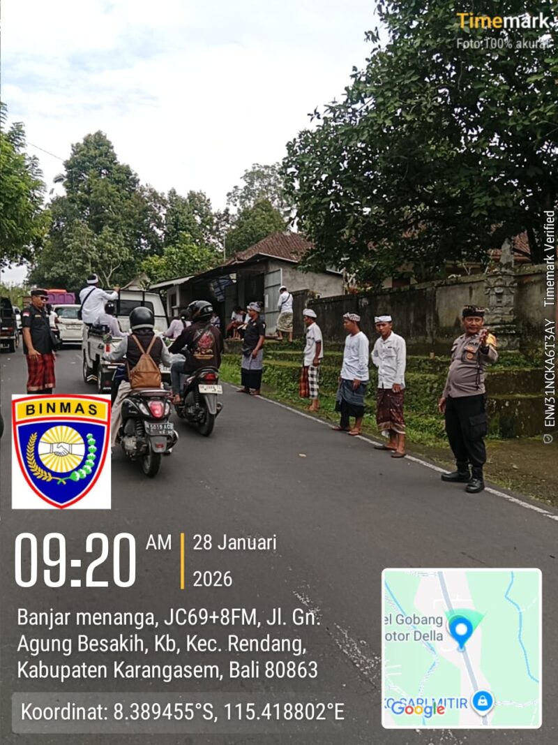 Personel Polsek Rendang melaksanakan pengamanan kegiatan masyarakat ini merupakan sinergitas Polri dan Pecalang di desa adat guna memberikan pengamanan saat pelaksanaan kegiatan adat yang ada di wilayah Polsek Rendang guna dapat memberikan rasa aman dan nyaman di masyarakat sehingga kegiatan masyarakat bisa berjalan dengan aman dan lancar.