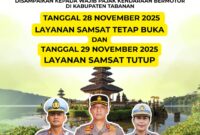 Tabanan – Pada hari jumat tanggal 28 november 2025 tetap buka bertepatan hari raya kuningan bagi umat hindu samsat tabanan libur dalam memberikan pelayanan…
