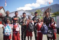 Senyum Anak-anak Kampung Pruleme, Distrik Mulia, Kabupaten Puncak Jaya, Papua, tampak merekah saat prajurit Satgas Yonif 743/PSY membagikan perlengkapan sekolah berupa tas dan alat…