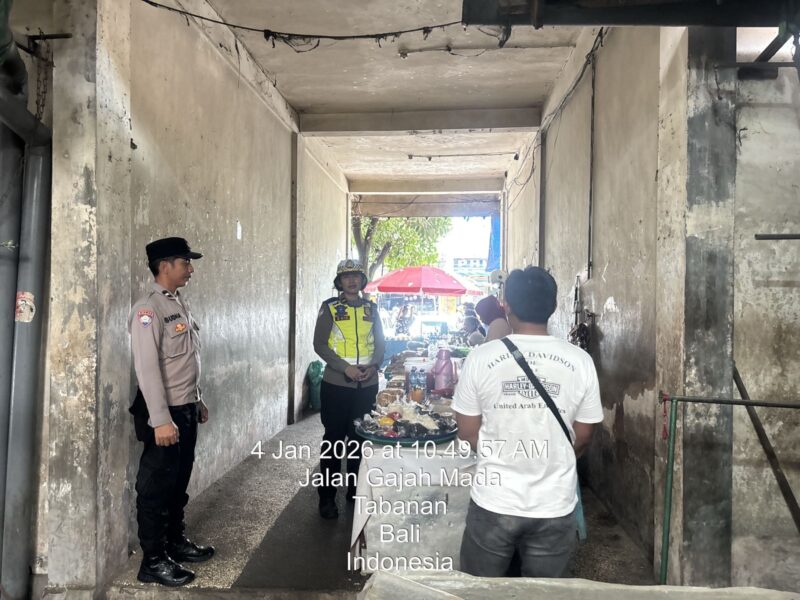 Polres Tabanan – Polsek Tabanan Minggu 4 Januari 2026 – Dalam rangka menjaga stabilitas keamanan dan ketertiban masyarakat (Kamtibmas) di awal tahun baru 2026, jajaran kepolisian menggelar kegiatan patroli dialogis di kawasan Pasar Tabanan, pada hari Minggu (4/1/2026).