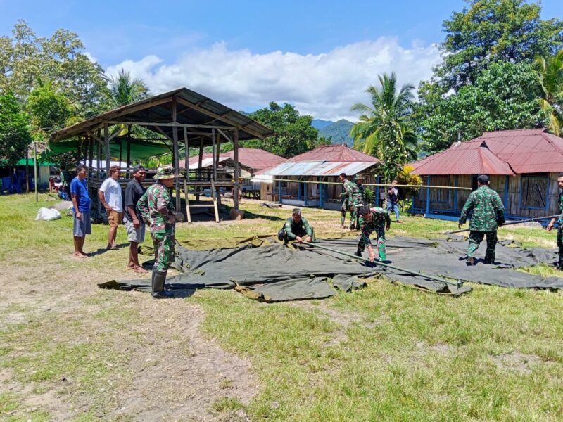 Ende – Guna mengantisipasi cuaca hujan yang dapat menghambat proses pekerjaan, anggota Satuan Tugas TNI Manunggal Membangun Desa (TMMD) Ke-128 Tahun Anggaran 2026 mendirikan tenda di lokasi kegiatan, tepatnya di Desa Aelipo, Kecamatan Wewaria, Kabupaten Ende, Minggu (26/4/2026).