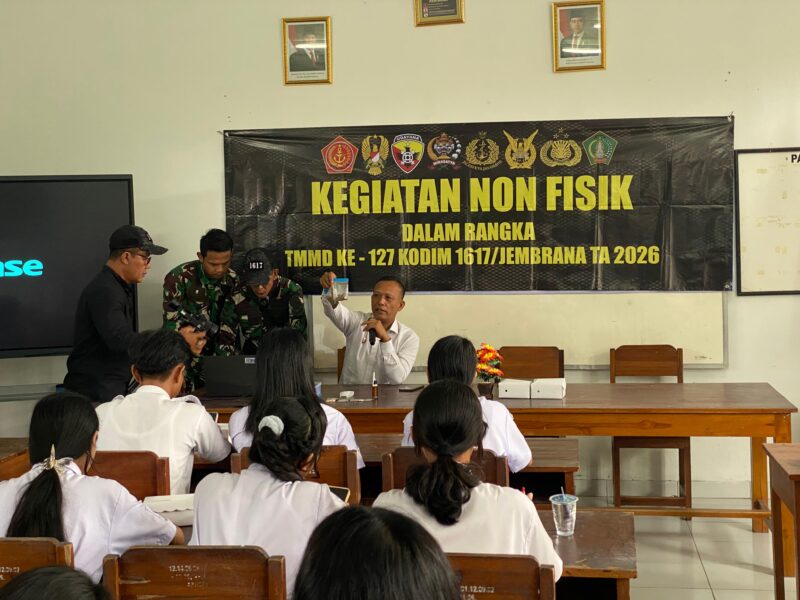JEMBRANA – Dalam upaya memproteksi generasi muda dari ancaman narkotika, Satgas TNI Manunggal Membangun Desa (TMMD) ke-127 Kodim 1617/Jembrana melaksanakan kegiatan non-fisik berupa sosialisasi pencegahan, pemberantasan, penyalahgunaan, dan peredaran gelap narkoba (P4GN) bagi siswa-siswi SMA, Senin (23/02/2026).