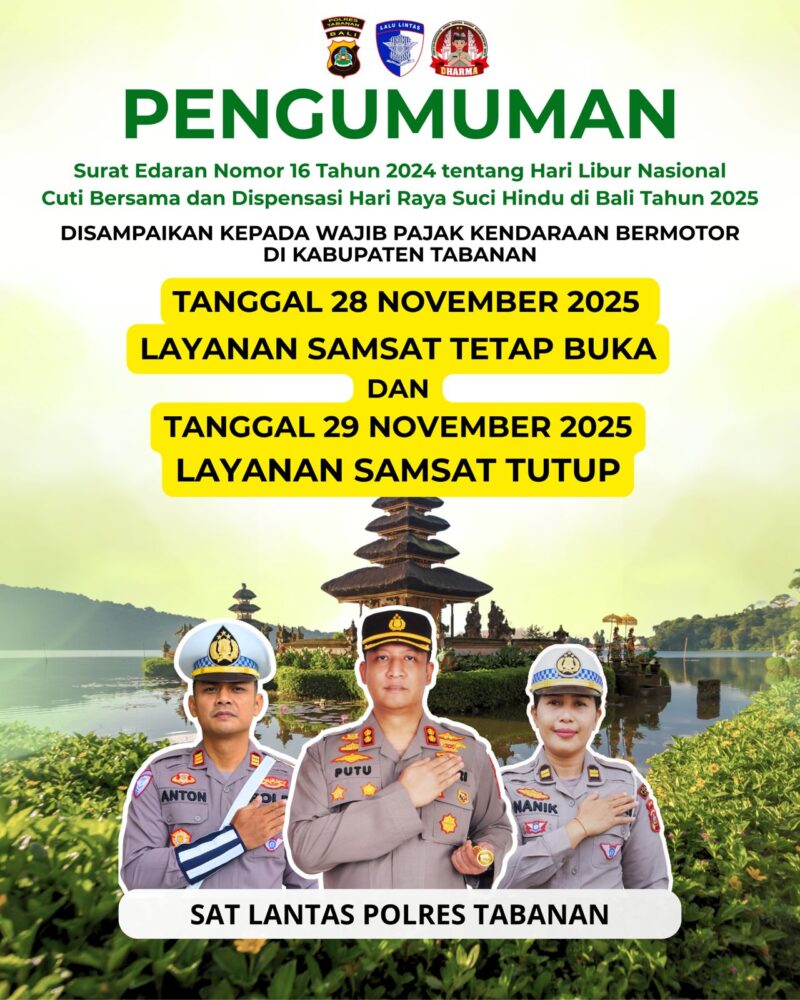 Tabanan – Pada hari jumat tanggal 28 november 2025 tetap buka bertepatan hari raya kuningan bagi umat hindu samsat tabanan libur dalam memberikan pelayanan bagi masyarakat
