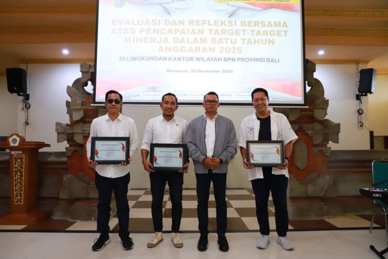 DENPASAR – Kantor Pertanahan (Kantah) Kabupaten Tabanan menerima sejumlah penghargaan kinerja dalam kegiatan Evaluasi dan Refleksi Bersama Capaian Tahun Anggaran 2025 yang digelar oleh Kantor Wilayah Badan Pertanahan Nasional (BPN) Provinsi Bali, Selasa (30/12/2025).