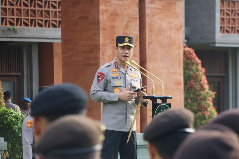 Kepala Kepolisian Daerah Bali, Irjen Pol. Daniel Adityajaya, S.H., S.I.K., M.Si., memimpin apel jam pimpinan di halaman depan Mapolda Bali, Senin 9 Maret 2026.