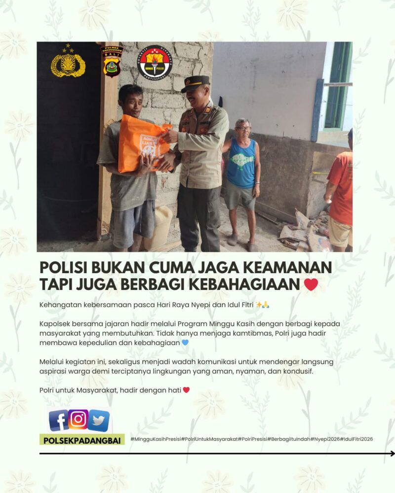 Karangasem – Polsek Kawasan Pelabuhan Padangbai– Dalam rangka mempererat hubungan dengan masyarakat serta meningkatkan kepedulian sosial, Kapolsek Padangbai, Kompol I Wayan Gede Wirya, S.A.P.,M.A.P, bersama jajaran melaksanakan kegiatan Minggu Kasih pasca perayaan Hari Raya Nyepi dan Hari Raya Idul Fitri (Lebaran) Tahun 2026, bertempat di wilayah hukum Polsek setempat, Minggu,22 Maret 2026.