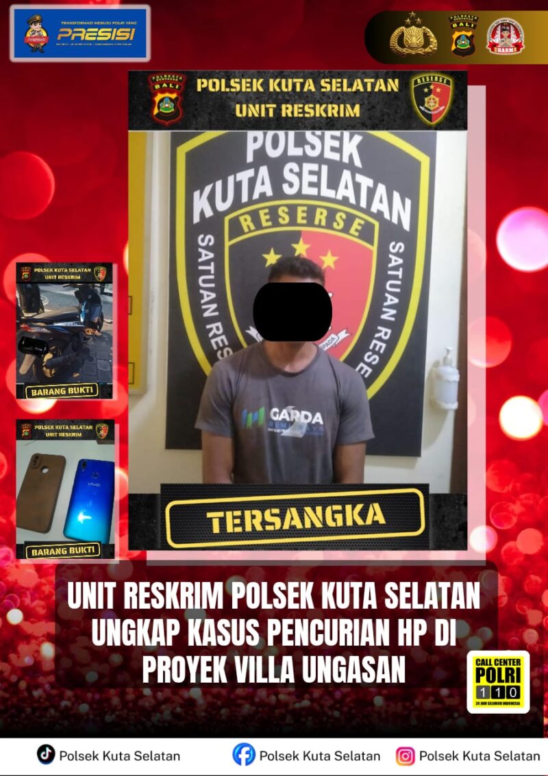 Denpasar – Unit Reskrim Polsek Kuta Selatan berhasil mengungkap kasus tindak pidana pencurian handphone yang terjadi di area proyek pembangunan villa, Jalan Pura Masuka Gang Kapuk, Desa Ungasan, Kecamatan Kuta Selatan, Kabupaten Badung.