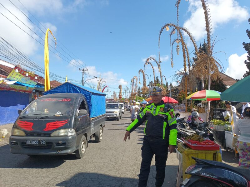 Dengan pendekatan yang humanis dan sigap, personel kepolisian aktif memberikan pelayanan kepada masyarakat, terutama dalam mengantisipasi kepadatan kendaraan dan menjaga keselamatan pejalan kaki di sekitar kawasan pura yang cukup ramai.