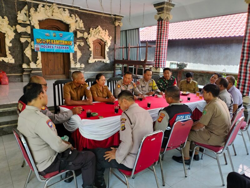 Tabanan – Kapolsek Selemadeg Kompol I Made Subadi, S.H., didampingi Kanit Binmas dan jajaran, menyelenggarakan program unggulan “Ngopi Kamtibmas” di Aula Kantor Perbekel Desa Selemadeg, Senin (13/4/2026). Kegiatan yang berlangsung santai namun produktif ini dihadiri oleh jajaran Bhabinkamtibmas, Babinsa, serta Sekretaris Desa beserta staf, sebagai wujud nyata kehadiran Polri di tengah masyarakat untuk mendengarkan langsung kendala keamanan di wilayah tersebut.