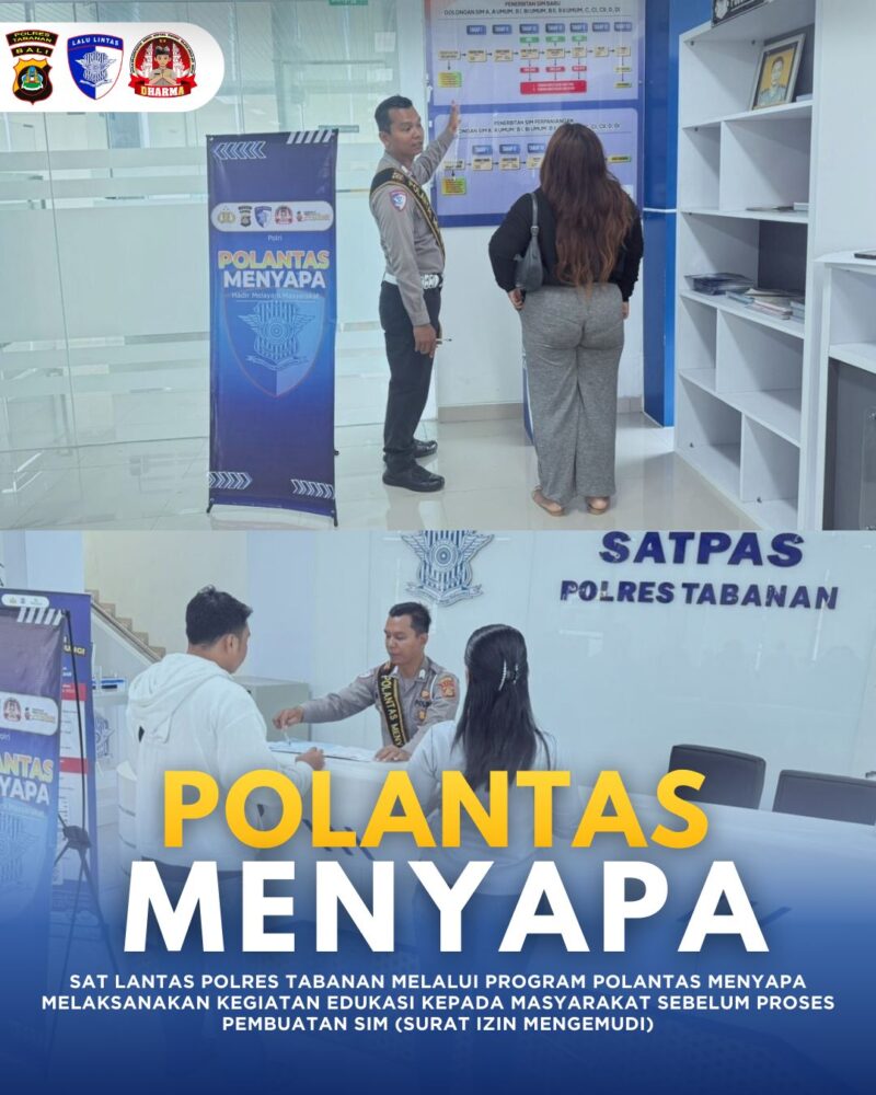 Seijin Kapolres Tabanan AKBP I Putu Bayu Pati, S.I.K., M.H., Sat Lantas Polres Tabanan melalui program Polantas Menyapa melaksanakan kegiatan edukasi kepada masyarakat sebelum proses pembuatan SIM. Edukasi ini bertujuan memberikan pemahaman yang jelas terkait alur dan tahapan pembuatan SIM agar pemohon dapat mengikuti proses dengan tertib dan lancar.