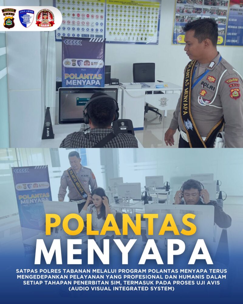 Seijin Kapolres Tabanan AKBP I PUTU BAYU PATI, S.I.K., M.H., Satpas Polres Tabanan melalui program Polantas Menyapa terus mengedepankan pelayanan yang profesional dan humanis dalam setiap tahapan penerbitan SIM, termasuk pada proses uji AVIS (Audio Visual Integrated System).