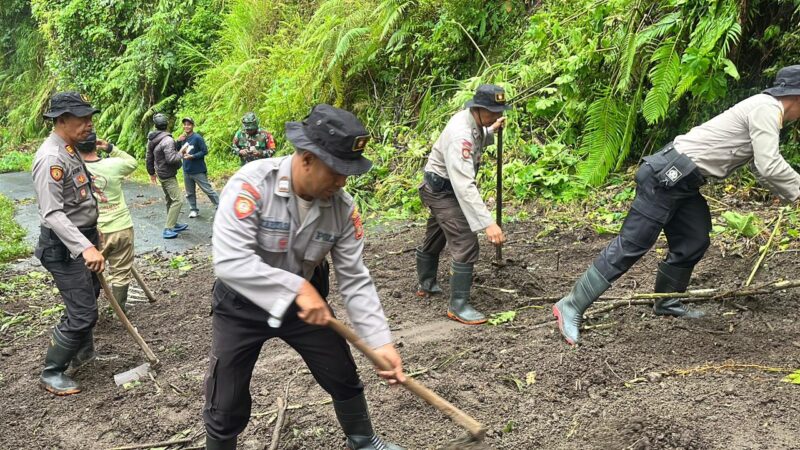 Bangli – Polres Bangli bersama Polsek Kintamani melaksanakan kegiatan gotong royong pembersihan material tanah longsor yang menutupi ruas jalan penghubung Banjar Wanagiri dengan Banjar Wanasari Desa/Kecamatan Kintamani, Kabupaten Bangli, pada Sabtu, 10 Januari 2025, mulai pukul 07.45 Wita s.d 10.00 wita
