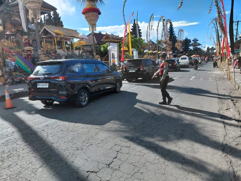 Bangli — Polsek Kintamani kembali menunjukkan kesiapsiagaannya dalam memberikan pelayanan terbaik kepada masyarakat dengan melaksanakan pengamanan dan pengaturan arus lalu lintas di depan Pura Batur, Senin (20/4/2026).