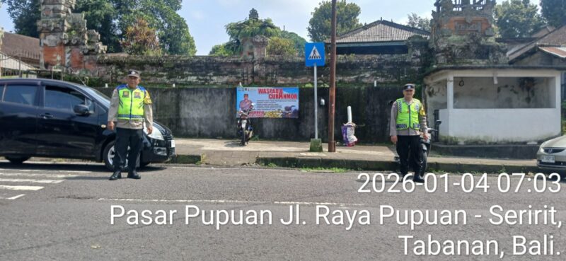 Polres Tabanan – Polsek Pupuan, Minggu, 4 Januari 2026, mulai pukul 07.00 s/d 09.00 Wita, personel Polsek Pupuan melaksanakan kegiatan Strong Point sebagai upaya menjaga kelancaran arus lalu lintas (kamtibcar lantas) serta menciptakan situasi kamtibmas yang aman dan kondusif di wilayah hukum Polsek Pupuan, khususnya pada hari libur yang diwarnai meningkatnya aktivitas masyarakat.