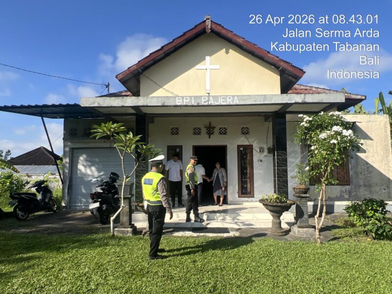 Tabanan – Polsek Selemadeg menunjukkan komitmen nyata dalam menjaga toleransi dan keamanan wilayah melalui pengamanan intensif ibadah Minggu Umat Kristiani, Minggu (26/4/2026). Dipimpin langsung oleh Perwira Pengawas (Pawas) Aiptu Agus Purwanto, S.H. personel Kepolisian dikerahkan untuk memastikan rangkaian ibadah di Rumah Ibadah Tirta Urip dan Balai Pembinaan Iman (BPI) Gloria, Desa Bajera, berjalan dengan khidmat dan aman.