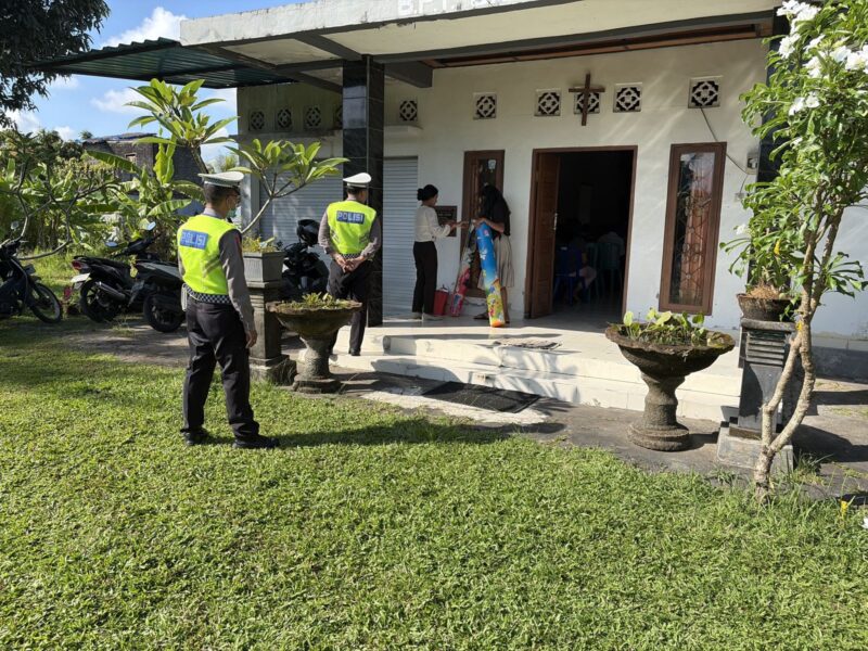Tabanan – Personel Polsek Selemadeg melakukan penebalan keamanan dalam rangkaian ibadah Minggu umat Nasrani di Rumah Ibadah Tirta Urip dan Balai Pembinaan Iman (BPI) Gloria, Desa Bajera, Minggu (19/3/2026). Dipimpin Pawas Aiptu I Nyoman Artana, petugas melakukan sterilisasi area dan pengawasan melekat sejak pukul 08.00 Wita guna menjamin kekhusyukan puluhan jemaat yang mengikuti prosesi ibadah di bawah pimpinan Pendeta Sukarnayasa dan Pendeta Fajar Pratama.