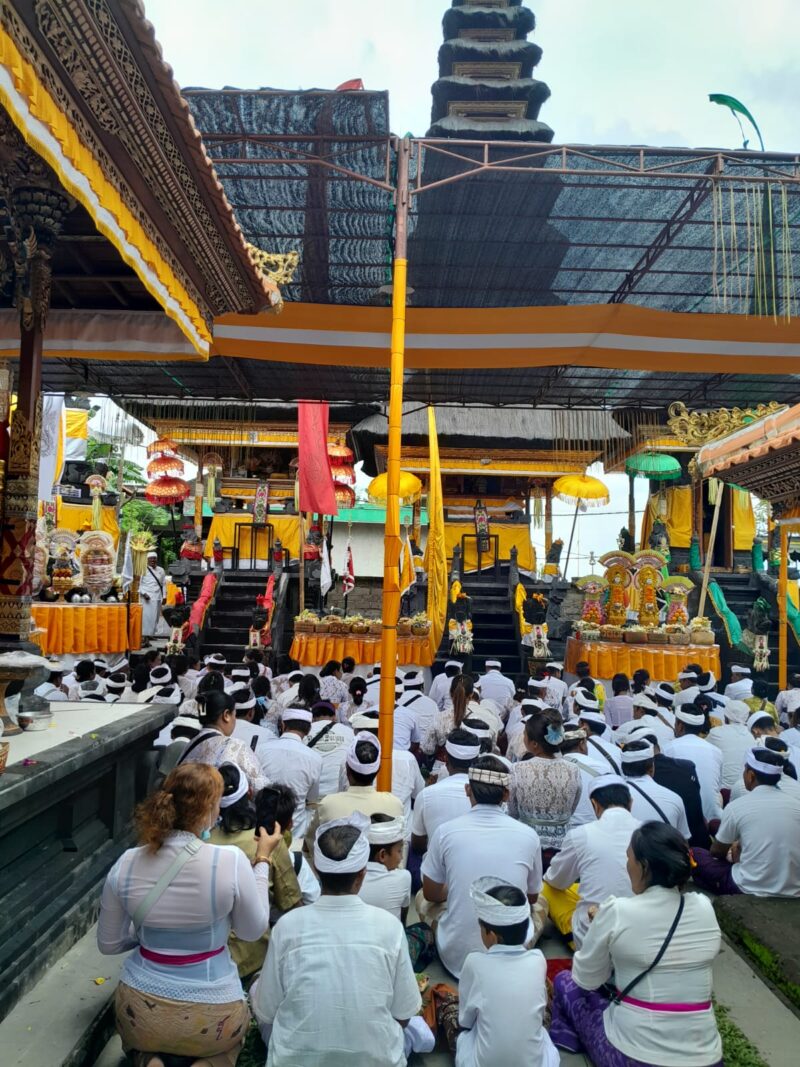GIANYAR – Pemedek yang merupakan Pratisentana Shri Nararya Kreshna Kepakisan, Sabtu (29/12/2025), bertepatan Saniscara Wuku Kuningan, memadati utama mandala, Dalem Agung Pura Kawitan Shri Nararya Kreshna Kepakisan, Selukat, Desa Keramas, Kecamatan Blahbatuh, Gianyar, untuk melakukan persembahyangan Pujawali Ida Bhatara Kawitan.