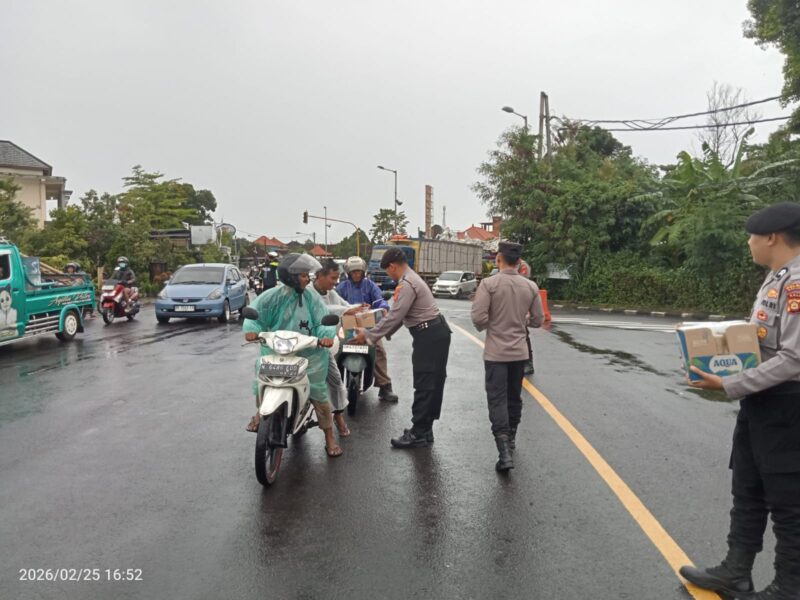Mangupura – Dalam rangka menyambut bulan suci Ramadhan 1447 Hijriah tahun 2026, Satuan Pengamanan Objek Vital (Satpamobvit) Polres Badung menggelar kegiatan pembagian takjil kepada masyarakat di kawasan Simpang Beringkit, Mengwi, Rabu (25/2/2026) sore. Kegiatan ini bertujuan untuk berbagi kebahagiaan dengan masyarakat yang menjalankan ibadah puasa sekaligus mempererat hubungan silaturahmi antara Polri dan warga. Sebanyak 100 paket takjil berupa cendol dan bubur kacang hijau dibagikan kepada pengendara, pejalan kaki, hingga penumpang bus yang melintas di lokasi tersebut.