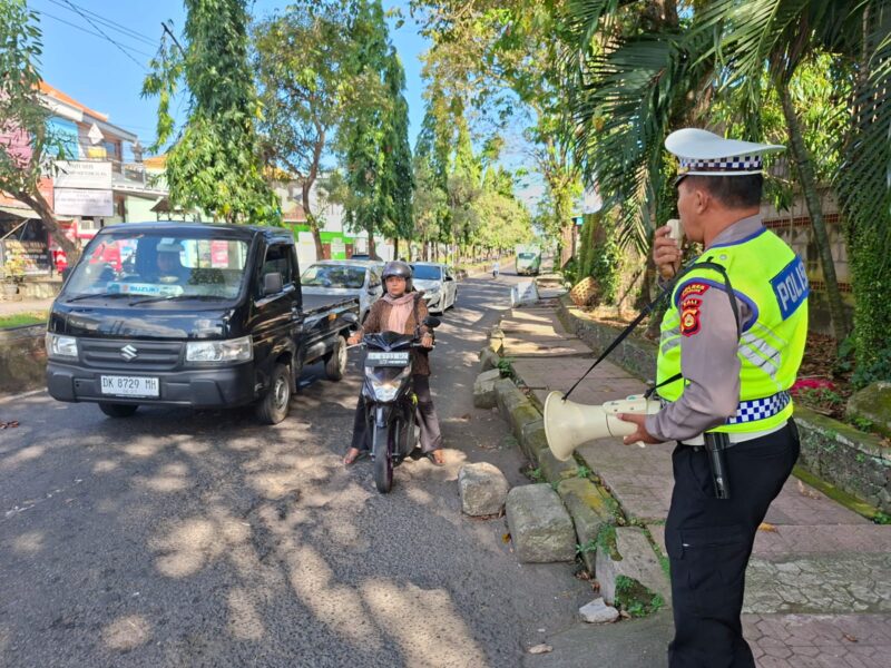 Klungkung – Unit Kamsel Satuan Lalu Lintas Polres Klungkung secara rutin melaksanakan kegiatan penerangan keliling serta pembagian brosur imbauan tertib berlalu lintas di kawasan Simpang Galiran, Kabupaten Klungkung, (17/4).