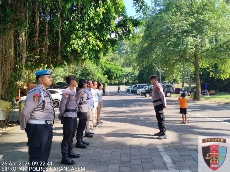 Karangasem | Sipropam Polres Karangasem melaksanakan pengawasan dan absensi kehadiran personil yang terseprin pam objek wisata, pada Minggu 26/4/2026.