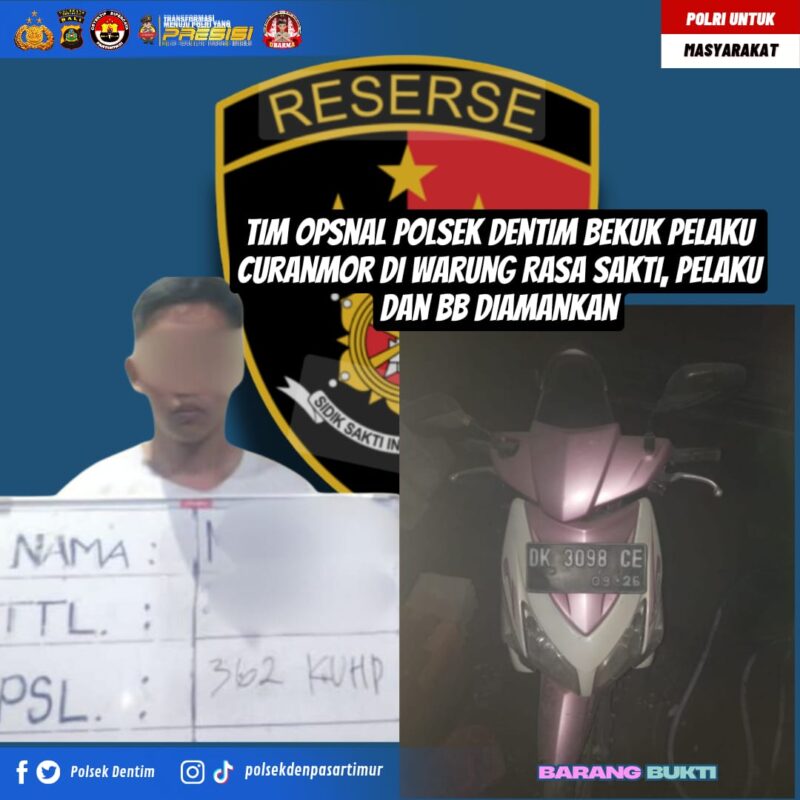 Tim Opsnal Unit Reskrim Polsek Denpasar Timur (Dentim) berhasil mengungkap kasus pencurian kendaraan bermotor (curanmor) yang terjadi di Warung Makan Rasa Sakti, Jalan Merdeka No. 1, Tanjung Bungkak, Sumerta Kelod. Pelaku berhasil diamankan bersama barang bukti berupa sepeda motor dan uang tunai milik korban.