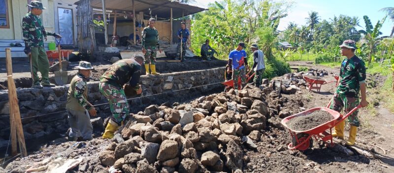 Anggota Satgas TMMD bersama masyarakat setempat tampak bahu-membahu di lokasi kegiatan. Semangat gotong royong menjadi kunci utama dalam mempercepat pembangunan talut yang berfungsi sebagai penahan tanah sekaligus menunjang akses jalan usaha tani agar lebih aman dan tahan lama.